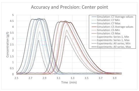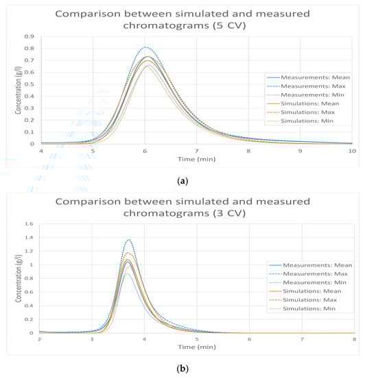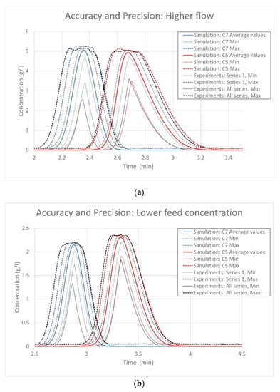 Simulated chromatograms, originating from the same set of parameters, should not vary between several runs as long as all parameters are kept the same. However, the model parameter determination experiments are subject to a certain error. These errors are calculated and used to define minimum and maximum values for model parameters. Simulations are carried out with all parameters at average value, a single parameter set to minimum or maximum, all parameters at minimum or maximum and randomized variations of parameters within the min/max range. This randomization is done with Monte Carlo simulations. Again, a mean value chromatogram with an envelope curve is generated, which should lie completely within the experimental envelope curve. This approach is done at least twice to prove both accuracy and precision.