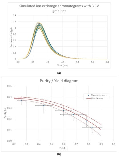 Experimental validation runs for case study one consisted of IgG broth separated on ion exchange columns. The feed broth was from the same harvest step; however, split into four batches. Each batch was diafiltrated separately. A total of 99 µL was injected into the column. A 3 to 5 CV gradient, respectively, from 100% loading buffer to 100% elution buffer, started directly after injection, followed by 3 CV regeneration and 3 CV re-equilibration. The flow was 0.5 mL/min. Five injections were done for each feed batch, resulting in 20 experiments in total. Column outlet was fractionated from 1 min before to 1 min after main peak in 0.5 min intervals and analyzed with protein A and size exclusion chromatography.