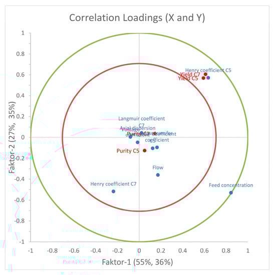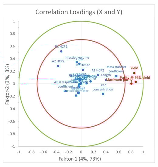 The simulation studies are analyzed for the quality and performance attributes, in this case purity and yield. This information as well as the input parameters and boundaries are fed into a statistical analysis tool. Partial Least Squares (PLS) regression now helps identifying the correlations between input parameters and target values. This can be visualized, for example, with correlation loading plots. Although PLS regression does not find causal relationships, it shows correlating effects. This helps to find critical process parameters and to assess the stability of the operation point.