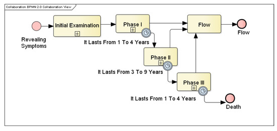 The primary line of the BPMN model is illustrated in Figure 3 when the process is divided into three stages of the disease. It is a simple model because these activities are then broken down to a greater depth. As described earlier for medical BP models, it is necessary to maintain simplicity and clarity for all participants supplying and read information. These models do not expect significant re-engineering, and so, the models are possible to build in depth.