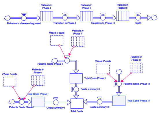 Based on the results of the study [10], the system dynamics approach was chosen to verify the results of the BPMN simulation quickly. For a system dynamics model of the Alzheimer’s disease cost process, a stock and flow diagram was selected in this article. The reason for this choice is above all the fact that in this case, there is not much emphasis on the feedback loop in the system, but above all on the basic modeling of the data and its interrelations. The following sections will describe the basic properties of the stock and flow diagram, its elements, and the tool in which the diagram was modeled.