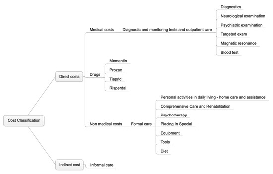 Concerning the stages as mentioned above of illness and activity, whether medical or non-medical care, they must be adequately linked to the relevant cost groups. This is the only way to avoid repetition of items, activity, and misrepresentation of the overall economic burden. Costs can theoretically be divided into direct and indirect costs, according to [45]. Direct costs are tied to a specific type of business and will be incurred in establishing and operating a medical program. These activities include treatment costs (outpatient and inpatient), medicines, doctor visits, diagnostic and laboratory tests, medical devices, rehabilitation, and many other items. Indirect costs are hard to express because they are mostly related to the care time spent on the patient by family or informal carers. They are a loss of productivity of the patient and the patient’s caregiver and loss of productivity due to the premature death of the patient. The author of publication [46] pointed out the necessity of the measurability of costs in specific units. Practically, it is possible to determine the extent or size of resources consumed during treatment or care. Costs can thus be divided according to the specification into detailed costs (medicines, tests, childcare costs, transportation to a doctor), diagnostic costs, average daily costs for treatment of different degrees of illness, and average regular costs. More differences cannot be found in other studies. In the Czech survey [47], direct health costs included outpatient examinations, hospitalization costs, institutionalization costs, pharmacological and non-pharmacological treatment costs, emergency services costs, nursing services costs, rehabilitation, and laboratory tests. The study [48] divided the costs between the direct costs of regular medical care (medical care, outpatient examinations, and medicines) and non-medical care. Similarly, the publication [49] divided the costs of regular medical care, which newly included institutional care, rehabilitation, medical equipment, non-medical services, and home nursing care, and informal care (time spent by caregivers with their clients).