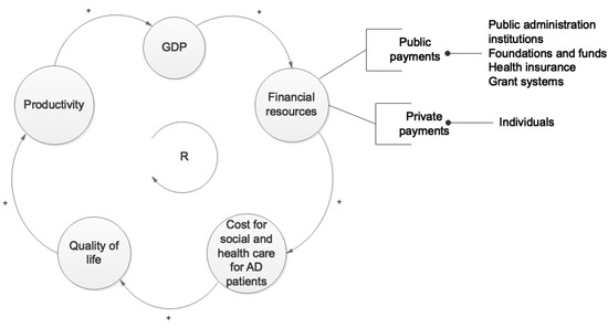Many stakeholders are involved in the financing of the treatment and care of Alzheimer’s, who often have decision-making powers on the amount of the sickness benefit. These are both private and public entities, which include public health and social care departments of regions and cities, which decide on the financing of beds and the creation and financing of capacities in residential facilities, but also for outpatient services. The combination of both health and social care in a single facility (whether social as the home for the elderly) and the follow-up funding make the situation very confusing. This is evidenced by the fact that at present, there is still no unified evidence of costs for AD patients in the Czech Republic or Europe. Figure 6 provides an idea of how financial resources are linked to key players in the context of economic development. In the case of increasing productivity in the economy, the level of GDP is rising, so there is a potential for raising financial resources for health and social care. This, in turn, increases the quality of life not only for the patients themselves, but also for their caregivers, which in turn translates into productivity growth in the system.