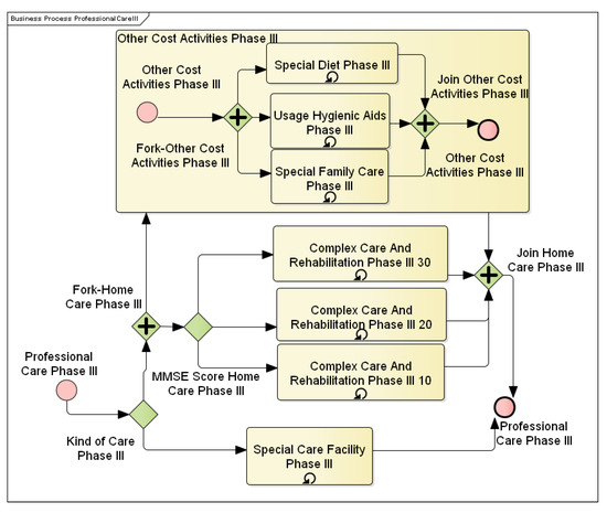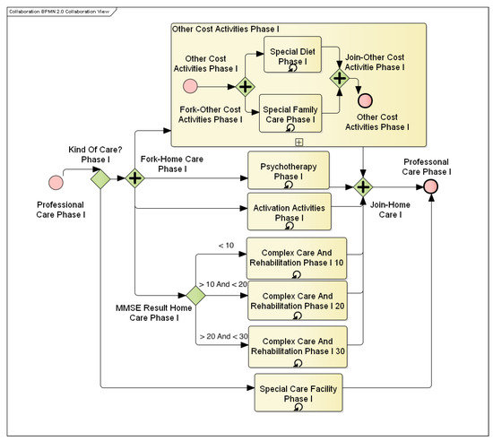 This section deals with modeling and data mining and processing. The process of Alzheimer’s described in Section 2.1 was abstracted only to those specificities of AD that allocate costs. The resulting model thus represents a process of slowing the progression or easing the patient’s daily life. The AD treatment model in this article is defined as a process that typically consists of parallel activities. Deciding which remedy is deployed is then based on a cyclically-performed MMSE test, the score of which is a crucial indicator of disease severity in this work. The essential second attribute for process control is the time aspect that is associated with determining the stage of the disease. Remedial measures then also depend on the determination of the disease stage. In the real world, determining the stage and severity of a disease is a complex problem that is based on many soft data and experience. Therefore, time will be the decisive criterion for the transition between stages. Each stage lasts for a specific time that is reflected in the process. Because of the technical limitations of the Software (SW) used (Enterprise Architect), the length of each stage of the disease was fixed. A particular element of coincidence brings in this model the AD drop element. Each time the MMSE test is performed, the MMSE score may decrease. If this decline is substantial, the patient is discontinued from cognitive pharmacological therapy. After the transition to the next phase, cognitive treatment is restarted, and its efficacy is checked. Each phase of AD then has the differently-defined complexity of individual activities. Typically, medicines change along with the progressing disease, and the nature of patient care changes. In the early stages of care, care is directed, as much as possible, to slow the progression of the disease and keep the patient in a regular life regime. In the following stages, care is more focused on minimizing impacts and the quality of life. Most of the activities are also repeated within one phase. Unless otherwise specified in the process, activities are repeated with a monthly period. Typical representatives of events with a different period are medical examinations. If the process used a day-to-month conversion, the month was considered to have 30 days.