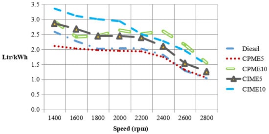Figure 1 shows the BSFC for diesel, CPME and CIME biodiesel blends at various engine speeds. It can be observed that all the blended fuel have higher BSFC compared to the diesel fuel except CPME5 blend. On average, biodiesel blended fuels have 16%–21% higher BSFC than diesel fuel. This finding is consistent with the literature [30,31]. Öztürk et al. [31] investigated the mixture of canola oil–hazelnut soap stock biodiesel-diesel and they found that the BSFC of blend fuel is more than the diesel fuel. The combined effects of the density, KV and HHV of the fuel caused that result. During the suction stroke, biodiesel is injected on a volume basis; thus more fuels are fed inside the cylinder [32]. Consequently, more fuel is needed in order to achieve the same power because the HHV of biodiesel is lower than diesel. Among the blends, the average BSFC was highest for CPME5 blend (3.352 Ltr/kWhr) and lowest for CPME5 (2.11 Ltr/kWhr), which can be attributed by the HHV of the CPME5 blends. According to the data presented in Table 3, fuel sample CPME5 have a slightly higher heating value (44.1 MJ/kg) compared with CIME10 and CIME5 (42.9 MJ/kg and 43.1 MJ/kg).