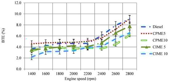 Figure 2 shows the BTE for all fuel samples at different speeds of the engine. It is seen that the BTEs of all fuel samples used in this study increases with the speed and maximum BTE was found for diesel fuel compared to blended fuels. This can be explained by the higher heating value and lower BSFC of diesel fuel. Diesel fuel showed maximum BTE followed by the CPME5, CIME5, CPME10, and CIME10 fuels. On average blended fuel lowers 2.40%–3.47% BTE compared to diesel fuel. The lower viscosity and higher heating value of diesel fuel, which improves the fuel atomization; thus increased the BTEs. The data obtained from the experiment are similar to the results presented by Sharma et al. [33]. They reported that the mixed Jatropha and Cottonseed blend produce lower BTE than diesel fuel. The reason was explained by the poor spray formation, higher viscosity, and poor ignition quality.