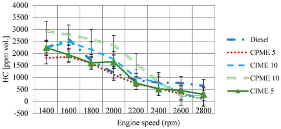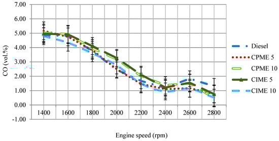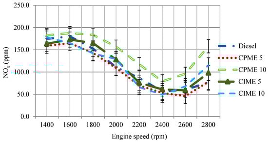 The nitrogen oxides emissions in exhaust consist of nitric oxide (NO) and nitrogen dioxide (NO2). Figure 3 shows the NOx emissions for diesel, and the CPME and CIME biodiesel blends at various engine speeds. It is evident that the NOx emissions increase with an increase in engine speed. It is clear that biodiesel blended fuels give more NOx emissions compared to diesel fuel. A similar report was found in the literature [33,34] for B7 and B100. The diesel as base line has an average NO emissions higher than CPME5 and CIME10 in low speed (1400–2200 rpm) that are 140.9 ppm.vol, 129.7 ppm.vol and 141.1 ppm.vol, respectively. This can be explained by the lean air/fuel ratio because biodiesel fuel has more inherent oxygen than diesel fuel. It has been reported that oxygenated fuel blends cause higher NOx emissions. Also, the higher KV of the biodiesel fuel leads to bigger droplets and shorter ignition delays, which affects the NOx emission. In addition, the unsaturated fatty acid content of biodiesels leads to fuels higher adiabatic flame temperature than diesel fuel, which causes higher NOx emission [34].