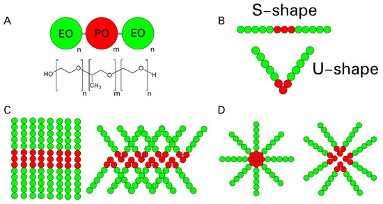 Poloxamers—commercialized as Pluronics (PL)—are linear nonionic triblock co-polymers of polyethylene oxide (PEO) and poly-propylene oxide (PPO). In Figure 1, a schematic representation is presented, where n is the number of hydrophilic ethylene oxide (EO) units, and m is the number of hydrophobic propylene oxide (PO) units. The length of each polymer block can be tuned to modify the poloxamer physical and chemical properties [1,2]. Many poloxamers have been approved by the Food and Drug Administration [3,4,5] to be used in pharmaceutical products [6,7,8,9]. In particular, Pluronic F127 (PL F127) is widely used in many applications due to its low toxicity, high drug loading capabilities, and ability to gel in physiological conditions at relatively low concentrations [7,10,11,12,13].