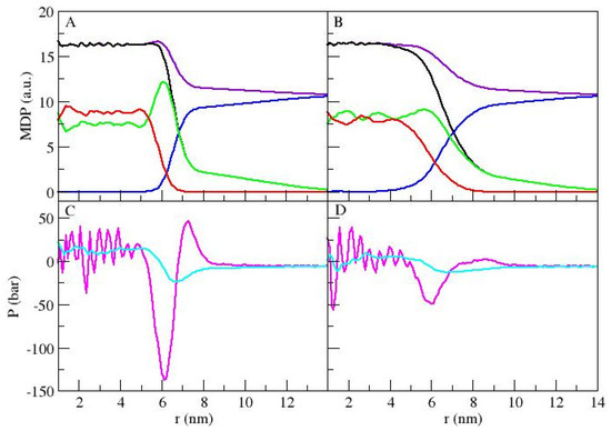 Mass density profiles (MDPs) and pressure profiles as functions of the radius for MS (A,C) and MU (B,D). For (A,B), total density (violet), total polymer (black), water (blue), poly-propylene oxide (PPO, red) and polyethylene oxide (PEO, green) are depicted. For (C,D), the normal (cyan) and tangential (magenta) pressure profiles are shown.