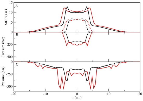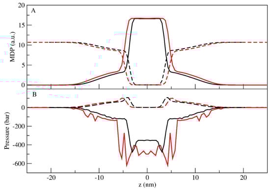 MDPs (A) and tangential pressure profiles along the z direction (B) for the total polymer (full line) and water (dash line). In both figures, the LS (black) and LU (red) simulations are presented.
