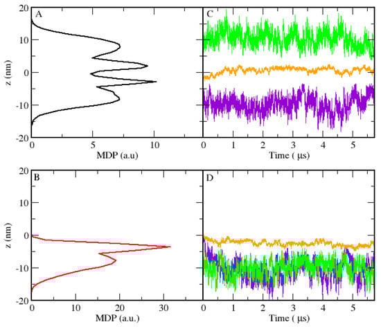 MDPs of a single polymer in the LS (A) and LU (B) cases, as functions of the z coordinate (rotated). Trajectories of the terminal PEO beads (green and violet) and the central PPO bead (orange) as functions of time for the same polymer of LS (C) and LU (D).