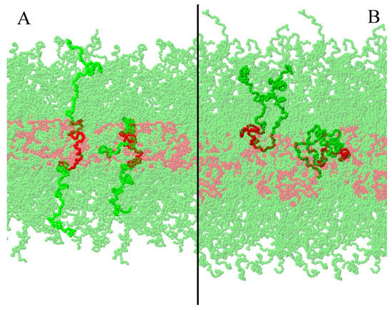 In the literature, it was reported that PL F127 could form lamellar phases [15], but information of the inner structural organization of lamellar phases is difficult to obtain using experimental techniques. Starting from two different initial conditions (LS and LU), we were able to find differences between them through the analysis of their structural and mechanical properties. We found that the studied lamellar properties were strongly influenced by the initial conformation. Under the described conditions, we did not observe transitions between U and S shapes in either direction during the simulation time. Nevertheless, different from what happens with lipid bilayers and other polymer-based systems [33,40], an amorphous core was present, where PPO and PEO beads coexisted. In Figure 7, representative snapshots of the two lamellar systems where the complex core structure can be observed are presented. Moreover, even if the polymers did not present the transition criteria, it is possible to notice that PEO was part of the lamellar core in both cases. Nevertheless, the size and flexibility of PL F127 prevented a whole PEO tail to cross through a very packed core (necessary for the U–S transition). U–S transitions are expected to be rare events, essentially driven by entropy. In the particular case of PL F127, specific water–polymer interactions (such as hydrogen bonds) could play an important role in these transitions. In coarse-grained simulations, these interactions affect free-energy barriers. In this way, the transition state energy evaluation could be challenging and not necessarily subject to cooperative events. Being out of the scope of this work, further exploration of this issue will be addressed in the future.