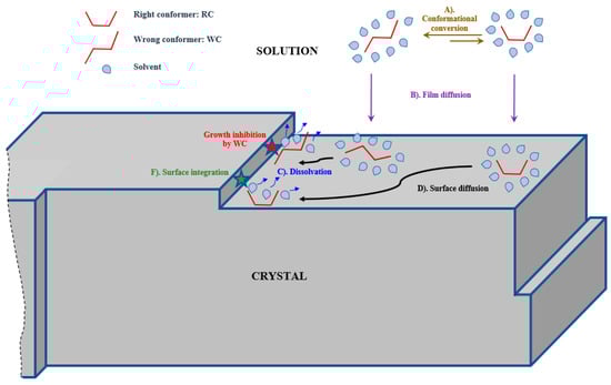 For well mixed solutions containing slow inter-converting conformers, surface diffusion was found to not limit the process [71]. Surface diffusion can be neglected because of the typical low required to achieve this step, found to be in the range of 1 to 2 kcal/mol [127]. In addition, solute dessolvation involves minimum enthalpy variation and hence, can also be neglected [128]. In contrast, for a conformational change in the case of atropisomers are typically higher than 10 kcal/mol [50,84] and activation energies for solute integration typically lie in the range 5 to 25 kcal/mol [128,129,130]. Hence, film and surface diffusions and dessolvation can be neglected and the simplified overall process of crystal growth from solutions containing atropisomers can be described by the sequence of elementary processes shown in Figure 2.