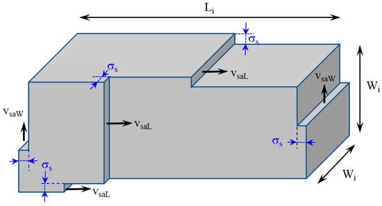 In the case of the growth of the two main characteristic faces of a growing crystal, the size of a given face is dependent of the step propagation velocity of the adjacent face (cf. Figure 2). Assuming that the growth inhibition factor () is independent of crystal faces, Equation (2) can be simplified for steps propagating on faces L and faces W as follows: