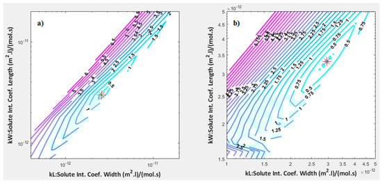 These modifications resulted in major improvement of the parameter estimation algorithm with execution times shortened from several hours to ca. 5 to 20 min, depending on the length of the experiment utilized for the estimation. The parameter estimation algorithm flow chart is shown on Figure 4. Both algorithms for parameter estimation and resolution of the model were coded in MATLAB®. An example of the variation of the objective function with the solute integration coefficients and localization of the global minima of the total error is shown on Figure 5.
