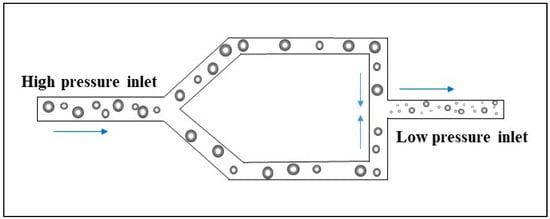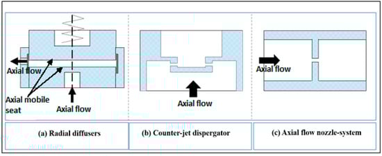 All in all, conventional high-pressure homogenizers employ pressures between 50 and 100 MPa. Nevertheless, with new technologies, an instrument utilizing pressures as high as 350 MPa has been developed recently [24]. In HPH, a small gap—usually with a gap height around 1 to 10 nm—causes the sudden pressure drop across HPH to reach a few thousand bars; the different phases composed of oil, water, and surfactant are forced into droplets and experience extreme shear and elongational stress, leading the droplets to be disrupted into finer droplets. The mixture is typically passed many times through the homogenizer until the droplet size is approximately constant [25,26,27]. Due to many different factors, for example, turbulence, and elongational and shear stress as well as cavitation, the fluid-dynamic stresses in HPH become higher. These factors are superior than the others, depending on the equipment used, process fluid properties, droplet composition, and operating conditions [28]. The droplet size will keep reducing as the difference in pressure heightens, unless in the case of the occurrence of coalescence. In HPH, increasing the pressure difference or increasing the energy density will decrease the droplet diameter unless coalescence occurs. However, the disruption unit also gives impact to the droplet sizes as they influence the flow pattern, which will specify droplet breakup [29]. In the homogenization chamber, three flow patterns of disruption units can be found, as seen in Figure 1.