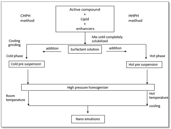 Radial diffusers are comprised of an axially mobile seat that allows for variation in the flow rate by changing the slit width [26]. The counter-jet dispergator includes a collision area of two or more opposed jets of the emulsion. There are no movable parts for counter-jet dispergators or the axial flow-nozzle systems, which makes them suitable for very high pressures. Nozzle aggregates can be distinct by their axial flow direction. Simple orifices are normally made up of 0.1–2 mm diameter round holes. It has been proven that when the same energy density is used, different disruption units produce different droplet sizes. The most important advantages of HPH for industrial production is that it is scalable, easy to operate, efficient, and has high reproducibility [27]. In HPH, an emulsion is formed by controlling the variation of the emulsifier and how fast the rate of coating the newly produced interface in the homogenizer is. Hydrodynamic conditions within the break-up zone, the rate of energy dissipation, the viscosity of the two phases, and the residence time in the break-up zone determine the formation rate of the new interface [30]. There are two methods that can be used in HPH, which are the hot or cold HPH technique. Both techniques have their own advantages, but the cold HPH technique is used for extremely temperature-sensitive compounds [31]. In both techniques, the active compound is dissolved or dispersed in the melted lipid phase, but in the hot HPH technique, the mixture is dispersed into a hot surfactant solution above the melting point by high-speed stirring, whereas in the cold HPH technique, the combination of the active compound and lipid phase is cooled down, ground, and then dissolved into a cold surfactant solution so that a cold pre-suspension of micronized phase is formed [32]. Next, for both approaches, the pre-emulsion goes through HPH at high temperatures for the hot HPH technique or room temperature for the cold HPH technique to acquire the NEs. In order to obtain narrow size distribution of NEs, an additional factor can be taken into consideration. The higher the number of cycles of the emulsion in HPH, the droplets will encounter the peak shear rate generated by a flow-producing device during emulsification to obtain low polydispersity NEs at some point [33]. Nevertheless, poor productivity and component deterioration due to the generation of much heat is the main disadvantage of HPH. Sharma et al. [34] stated that with this method, only O/W NEs with less than a 20% oil phase can be successfully obtained, while NEs with a high viscosity with sizes smaller than 200 nm cannot be prepared. The summary of the method is shown in Figure 2.