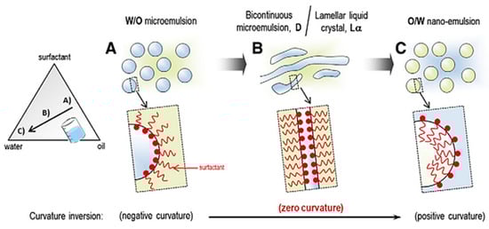 In the phase inversion temperature method (PIT), NEs are spontaneously formed by changing the temperature–time profile of the components, and prompt temperature changes hinder the occurrence of coalescence and thus, the formation of stable NEs. At room temperature, the combination of oil, water, and nonionic surfactant demonstrates a positive curvature. The impact of surfactant concentration on the formation and stability has been reported in previous work [53,54,55,56]. Furthermore, the PIT method is based on the alterations in the dispersity of polyoxyethylene-type nonionic surfactants with temperature. With increasing temperature, these kinds of surfactants will turn lipophilic due to the dehydration of the polyoxyethylene chains. At low temperatures, the surfactant monolayer has a large positive spontaneous curvature forming oil-swollen micellar solution phases (or O/W microemulsions), which may coexist with an excess oil phase. At high temperatures, the spontaneous curvature becomes negative and water-swollen reverse micelles (or W/O microemulsions) coexist with an excessive amount of the water phase. At intermediate temperatures, the hydrophile–lipophile balance (HLB) temperature and the spontaneous curvature tend to be zero and a bi-continuous, D phase microemulsion containing comparable amounts of water and oil phases that coexist with both excess water and oil phases is formed [57,58]. In a research conducted by Astaraki [58], the production of NEs of n-dodecane in water using PIT, and the impact of the adjustments in NaCl and surfactant concentration on PIT and droplet size of n-dodecane was studied. Raising the NaCl concentration and using Brij30 as the surfactant caused a decrease in PIT. Additionally, the author found that the effect of the changes in concentration variation of the surfactant (Brij30) on the reduction in PIT and droplet size was more than that in the concentration of NaCl in the aqueous phase. In one study involving PIT, either the temperature or composition induced the inversion point and the surfactant phase structure (bi-continuous microemulsion or lamellar) affecting the size of the droplets [47]. Studies on NE formation by the PIT method have revealed a relationship between the minimum droplet size and complete solubilization of the oil in a microemulsion bi-continuous phase, independently of whether the initial phase equilibria were single or multiphase. The PIT method using nonionic surfactants and hexadecane or isohexadecane as oil component to produce NEs has also been investigated [57]. At 20 wt% of the oil and surfactant concentrations between 4 and 8 wt%, successful NEs with a droplet size in the range 30–130 nm were produced. With the increase in surfactant concentration, the NE droplet size and polydispersity index were reduced, which could be attributed to the rise in the interfacial area and the reduction in interfacial tension.