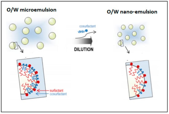 Spontaneous emulsification is another method in which nano-sized emulsion can be obtained. The chemical composition of both the oil and aqueous phases and the help of surfactants is really important in this technique [19]. Three stages are involved in this method, namely, (1) a homogeneous lipid phase consisting of oil and a lipophilic surfactant and another phase of a water-miscible solvent and hydrophilic surfactant were prepared; (2) the O/W emulsion is formed when the lipid phase is injected in the aqueous phase under nonstop magnetic stirring; and finally, (3) evaporation under reduced pressure is employed to remove the aqueous phase [24]. Small droplets of dispersed phase covered with surfactant in the continuous phase will occur because of the high affinity of the surfactant to the oil or the aqueous phase causes turbulence at the interface of both the dispersed phase and continuous phase as well as whether the surfactant is displaced toward the continuous phase. To produce very small emulsions, the turbulence at the interface of the two phases should be triggered and cosurfactants such as ethanol, acetone, and propylene glycol can be a great help. In these cases, the organic phase will contain oil, a surfactant, and a cosurfactant while the aqueous phase consists of water. The influence of many factors such as level, type, structure of the surfactant and cosurfactant, amount of surfactant to the dispersed phase, additive or nutritive constituents in the dispersed phase, level and type of the two phases and encapsulant, and the viscosity of the dispersed and continuous phases will affect the droplet size. To form NEs using this method, chemical energy released due to the dilution process with a continuous phase is used, usually at a constant temperature without any phase transitions (no change in the spontaneous surfactant curvature) in the system during emulsification [70]. A nanoemulsion will be obtained by the dilution of the microemulsion with water. From the oil/water interface, the cosurfactant (alcohol) diffuses to the water phase, which will disturb the formation of the microemulsion and make it thermodynamically unstable, thus forming NEs [71]. The schematic diagram is presented in Figure 5.