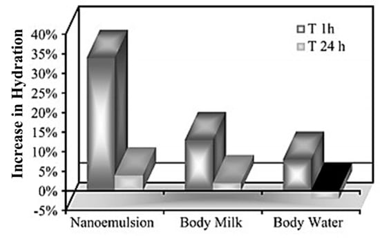 NEs have also been used as a vehicle for controlled delivery and as an effective transport vehicle in cosmetics. NEs will reduce trans-epidermal water loss. The Kemira nano gel-NE based carrier system is a patented system for cosmetic purposes; it will improve skin cell production and the penetration of active pharmaceutical ingredients (API) as well as provide a good skin feel [127]. Topical administration itself offers ample advantages and by combining it with NEs, this formulation may provide an improved way of drug delivery system. It can bypass the hepatic first-pass metabolism of the drug and related toxicity effects. A comparative study showed that after 1 h, the hydration power of the NEs was higher than the body milk and body water; after 24 h, the results portrayed the long-lasting impact of the NEs when compared to the other two [123]. These results are shown in Figure 7.