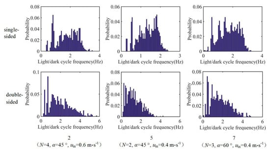fav under the conditions shown in Figure 13 was calculated for the 25 test groups in the orthogonal test. The result is compared with that obtained under single-sided illumination conditions (Figure 14). Adjusting the position and curvature of the L/D boundary according to the flow field increases fav of the particles. This increase occurs because the change in the L/D boundary increases the number of particles undergoing the L/D cycles, and the change in the L/D boundary can simultaneously increase the percentage of particles involved in the high-frequency L/D cycles. Taking group 6, which has the largest frequency increase, as an example, the number of particles participating in the L/D cycles under the conditions shown in Figure 13 is 59.1% higher than that under the single-sided illumination conditions. The probability density function (Figure 15) shows that the L/D cycle frequencies of most of the particles is near 1 Hz under the conditions shown in Figure 13. The percentage of particles participating in the high-frequency L/D cycles under these conditions is significantly higher than that under single-sided illumination. The increase in fav of the optimal combination under single-sided illumination (group 1 in Table 2) is the smallest (only 26.3%). These results show that in the case of single-sided illumination, the synergy between the flow field and the light field of group 1 is good.