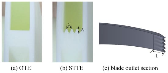Differences between two trailing edges: (a) original trailing edge (OTE), (b) sinusoidal tubercle trailing edge (STTE), (c) blade outlet section