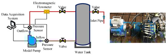 In order to obtain accurate test model pump data, the experiment was tested in a closed test rig [29], as shown in Figure 3. Pressure gauges with uncertainties of ± 0.2% are installed at the pump inlet and outlet for recording the pressure values. The flow rates of the experimental process are recorded by an electromagnetic flowmeter, the uncertainty is 0.2% class. Various flow rates (0.2–1.6QN) are regulated by valves located at the model pump outlet pipe. The test model pump is driven by a variable frequency motor with a speed of 3000 rpm. The uncertainty of the speed of rotation is 10 rpm. In order to ensure a constant speed during the experiment, a frequency inverter was used. In the experiment, the shaft torque is measured by a torque meter with uncertainties of ±0.5%. Sample signals of monitoring points are recorded by dynamic pressure sensors arranged around the volute.