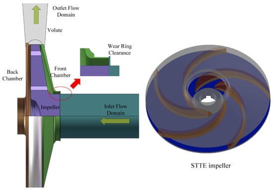 Considering the influence of leakage flow on the flow field, the computational domain of the full flow field was used, which has seven components, including, inlet extension, front chamber, impeller, volute, back chamber, outlet extension, and wear ring, as shown in Figure 4. The test STTE impeller is also shown in Figure 4. A pair of interfaces connects each adjacent computational domain. The working fluid is water at 298 K. To avoid a reverse flow appearing in the inlet boundary, the extension length of the inlet pipe is three times that of the impeller inlet diameter in the calculation process.