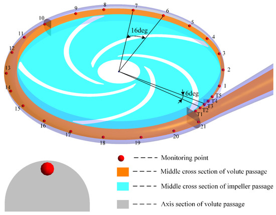 To get fluctuating pressure signals in the volute flow channel and the tongue region, 26 monitoring points are placed at the tongue region and the middle cross-section of the volute passage. However, in order to capture exhaustive pressure signals in the rotor–stator interaction region, five monitoring points T1–T5 are set near the tongue. And the angle is only 6 degrees between adjacent points. Detailed location distributions are shown in Figure 6.