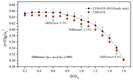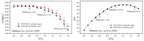 The performance of pumps are implemented under different flow rates from 0.2φN to 1.6φN. The CFD calculated results are obtained by steady-state simulation with the SST k-ω model. Figure 9 shows the head coefficient and efficiency curves of two blade trailing edge (BTE) profiles model pumps. The amplitude of the error bar represents the performance difference between the two model pumps under different operating conditions. For all relevant flow rates, the STTE profile pump is observed to have a better head hydraulic performance. Under the small flow conditions, there is little difference in the head performance, and the efficiency is almost constant. The difference in the head coefficient and efficiency between the two model pumps with the OTE and STTE profiles is about 2.3% and 0.93% at the nominal flow rate, respectively. The increase of the head and efficiency is due to the gentler flow of fluid from the STTE trailing edge. A typical wake-jet structure exists in the outlet area of the impeller, which causes the main energy loss of the centrifugal pump [49]. By modifying the trailing edge shape, the structure and frequency of the shedding vortex at the impeller exit are changed, and the development of the wake-jet structure is suppressed. It reduces the energy loss of the pump.