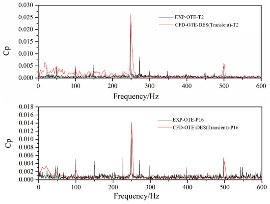 Comparison of experimental and numerical pressure spectra of OTE pump at the nominal flow rate at monitoring point16 and T2.