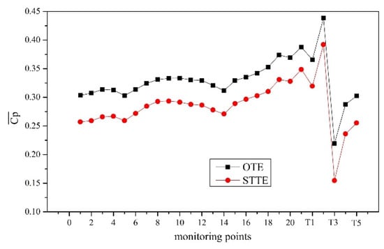 Figure 10 shows the pressure distribution of two model pumps in the volute at the nominal flow rate QN. No. Centrifugal pumps with two trailing edge profiles have a very similar variation in the circumferential pressure of the volute. However, the STTE profile has a smaller value at each monitoring point. The pressure value gradually increases from No.1, and the maximum value occurs at the region of the volute outlet. The maximum value of pressure is on monitoring point T2 and the minimum value of pressure is on monitoring point T3. This is because the shedding vortex on the blade hits the volute tongue and causes large pressure fluctuations [50,51,52,53].
