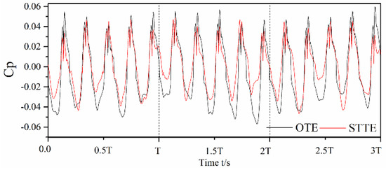 To clearly explain how the STTE profile affects unsteady pulsations, the DES model is used in a transient-state simulation to capture the fluctuating pressure signals and the flow patterns. Figure 11 reveals the comparison of two impellers time domain pressure signals at the monitoring point T2 at the nominal flow rate coefficient φN. The pressure fluctuation curve of the three periods is shown in Figure 11. As observed, periodic pressure fluctuations are evident, and five distinct peak and valley values occur alternately in a cycle. It depends on the number of blades in the impeller. At the same time, the STTE profile has lower pressure signals than the OTE profile. Obviously, the model pump with the STTE profile has better pressure stability. It is worth noting that the STTE profile does have a more positive effect on the pressure pulsations.