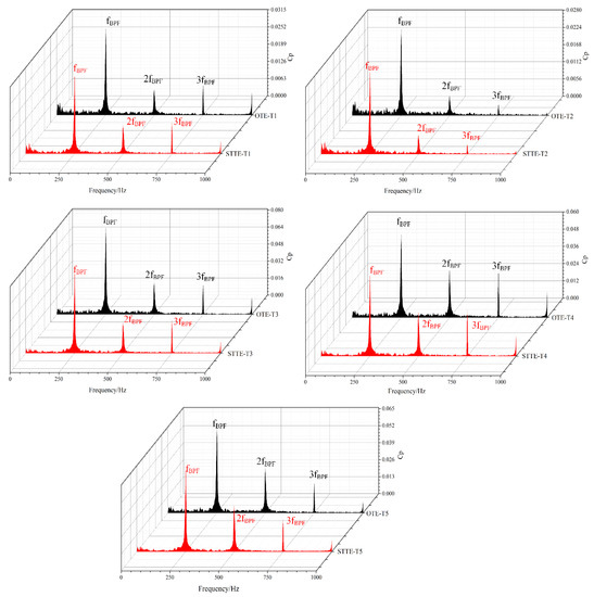 For a better analysis of the effect of the blade BTE shapes on pressure fluctuation, the collected fluctuating pressure signals in the tongue region are converted into a spectrum using fast Fourier transform (FFT). The pressure values of the last five revolutions at the nominal flow rate are selected. The violent rotor–stator interaction occurs in the tongue area. We select five monitoring points (T1–T5) in the tongue area for frequency domain analysis. As can be seen from Figure 12, the primary excitation frequency is fBPF and its harmonic frequency 2fBPF and 3fBPF. The peak at fBPF always governs spectra analysis. Meanwhile, pressure coefficient amplitudes of T3, T4, and T5 are much higher than points T1 and T2, which indicates that the rotor–stator interaction is more intense in this region. This results from the small radial clearance between impeller and volute. The points T1 and T2 are far away from the volute tongue, so the rotor–stator interaction is less intense, which results in smaller pressure amplitudes. By comparing the pressure pulsation amplitudes between the two model pumps, the Cp of STTE at points T1–T5 are reduced by varying degrees at fBPF and its harmonic frequencies. In the low-frequency zone below fBPF, the model pump with the OTE shape has several more complex frequencies compared with STTE shape at the volute area. There are some more complicated flow structures in the OTE model pump, such as flow separation. Table 3 lists the contrast of the pressure coefficient Cp at blade passing frequency between two pumps.