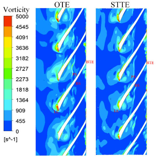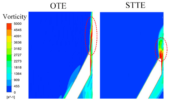 The internal flow field of the model pumps is analyzed to reveal the reasons for the pressure pulsation amplitude reduction at the nominal rate. In Figure 13, the vorticity contours of two model pumps at 50% span are shown. There are high vorticity areas at the inlet and outlet of the blade. One is associated with flow separation and the flow strike at the inlet region. The other one is produced by the wake-jet structure and shedding vortex. The rotor–stator interaction is very intense due to the hitting of the vortex shedding from the blade trailing edge with the volute tongue. Through comparing the vorticity contours of two BTE shapes, the vorticity of STTE is obviously more diminished than OTE in the blade inlet region. The shedding vortex is also weakened in the blade outlet region.