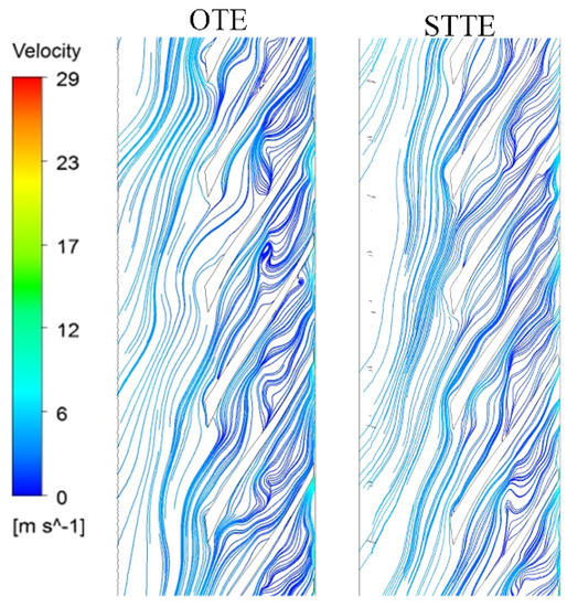 Figure 14 shows the partially enlarged view of vorticity contours at the blade trailing edge. The high vorticity area of the STTE impeller is shortened and the vorticity magnitude is also decreased. To further understand the internal flow pattern in the impeller, velocity streamlines are presented in Figure 15. It can be clearly distinguished that the STTE profile makes the flow field more uniform. For the OTE shape, flow field is quite disordered, and some vortices even occur on the pressure side of the blade. The STTE shape decreases flow separation in the blade inlet region and the middle flow channels.