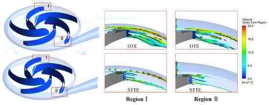 In order to understand the mechanism of the STTE trailing edge improving the pump performance and pressure pulsation, and better identify the shedding vortex pattern at the impeller outlet, the vortex core distribution in the blade trailing edge (BTE) area is presented in Figure 16. As shown in Figure 16. Comparing the two model pumps, it is found that the structure of shedding vortex changed greatly in the impeller BTE region. The large intact vortexes shedding from the blade trailing edge are divided into several small vortexes by the STTE profile. The total vortex core region of the STTE model pump is significantly smaller than OTE model pump. The interaction of small vortexes with the volute is also weaker than with large vortexes. It is acceptable to control vortex shedding by modifying the trailing edge profile, which is very important for pressure stability.