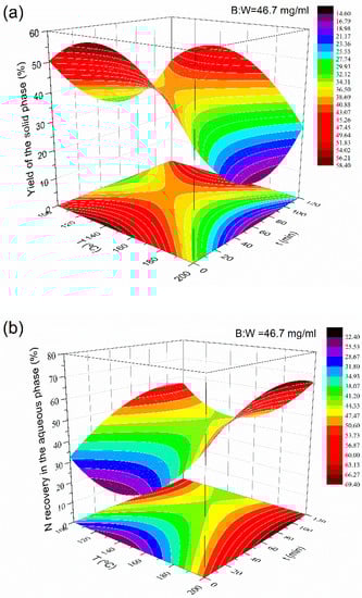 Finally, the influence of the temperature–time and the time–biomass:water ratio interactions ((XT–Xt, Xt–XB:W, respectively) was not significant on the N recovery in the aqueous phase since the p-values were higher than 0.05 in both cases (Figure 4 and Equation (2)).