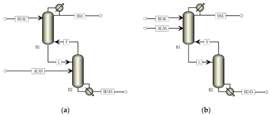 Flowsheets of SRDC with internal circulation of excess reactant. (a) SRDC with internal circulation of pre-excess AcAn; (b) SRDC with internal circulation of pre-excess BuAc.