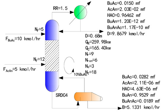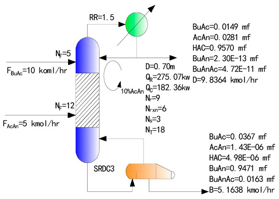 The application of internal circulation of excess reactant depends on tuning the condenser duty or reboiler duty of the SRDC. Therefore, it is important to simulate the processes shown in Figure 2a,b whose corresponding flowsheets in ASPEN are shown with Figure 3a,b. The position of the reactive section is fixed, but the simulation strategy is different depending on the different excess feed. When acetic anhydride is in excess, the rectifying section and the reactive section are separated from the stripping section, the tear flow is supplemented with an excess of 10% acetic anhydride, and the rectifying section is used to separate the excess acetic anhydride and acetic acid. When butyric acid is in excess, the rectifying section is separated from the reactive section and the stripping section, the tear flow is supplemented with an excess of 10% butyric acid, and the stripping section is used for the separation of the excess butyric acid and butyric anhydride.