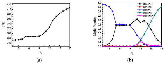 The temperature and liquid composition profile between SRDC4 trays. (a) The temperature profile between SRDC4 trays; (b) the liquid composition profile between SRDC4 trays.