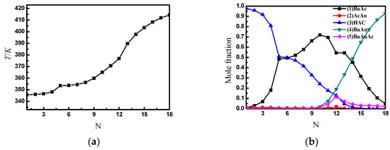 The reaction of acetic acid with butyric anhydride is homogeneous; it is also a series of reversible reactions without a catalyst, which is carried out in two steps as shown by Equations (1) and (2). The reaction rates of the two steps are quite different, and the rate of Reaction (1) is much greater than that of the second step. According to Li et al. [10], the most suitable reaction temperature is 343.15 K.