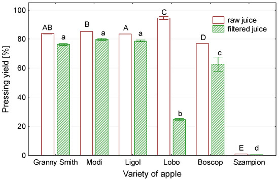 Raw juice and filtered juice pressing yield depending on apple variety. Different capital letters indicate values significantly different at p < 0.05 for raw juices. Different lowercase letters indicate values significantly different at p < 0.05 for filtered juices.
