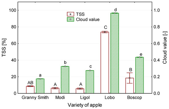 Cloud value is related to particle suspensions, composed of a mixture of protein, lipids, pectin and other minor components [27], and this is an important parameter of apple juice quality. The influence of apple variety on cloud value is presented in Figure 3.