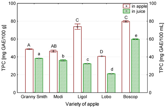 The influence of variety properties on total polyphenol content in fresh apples and in juice. Different capital letters indicate values significantly different at p < 0.05 in apples. Different lowercase letters indicate values significantly different at p < 0.05 in juices.