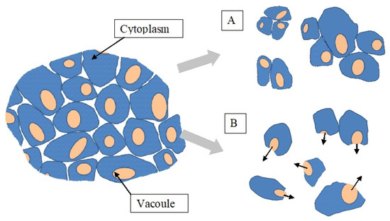 The cause may here be the different fracture mechanisms of tissues with different hardness. As shown in Figure 5, mostly singular cells break in hard tissues and their contents are released to the main juice mass, whereas soft tissues are disrupted into smaller fragments, in which cell walls that surround the cell contents remain undisturbed. Given that vacuoles are the target site for polyphenols [33,34,35,36], disruption of the cell wall and the tonoplast should be the key factor influencing the concentration of these compounds in the extracted juice.