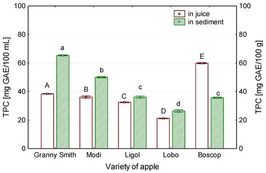 Influence of variety properties on total polyphenol content (TPC) in juice and in the sediment in juice. Different capital letters indicate values significantly different at p < 0.05 in juices. Different lowercase letters indicate values significantly different at p < 0.05 in sediment.