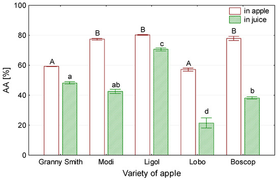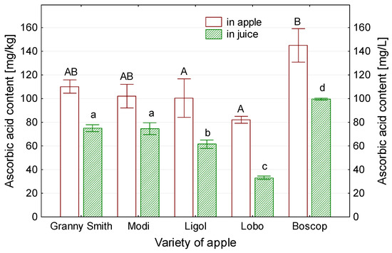 Figure 7 presents the influence of apple variety on content ascorbic acid in the fresh apples and apple juice. In the present study, the content of ascorbic acid in fresh apples ranged from 82 to 145 mg∙kg−1. Ascorbic acid content in juice was lower and ranged from 33 to 99.5 mg L−1.