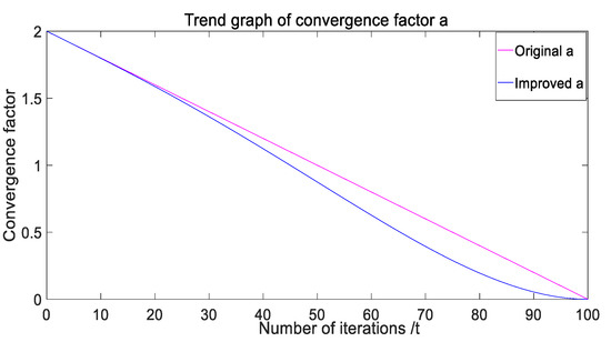 The comparison of original and improved a is displayed in Figure 1. The convergence factor of improved a nonlinearly decreases from 2 to 0. As the number of iterations increases, the decay rate of the convergence factor gradually decreases, which enhances the local search ability and the local optimal solution is more accurate. Therefore, this nonlinear convergence factor is more consistent with the actual convergence process of the algorithm, which can better balance the global search and local search performance of the algorithm and avoid the algorithm falling into local optimum.