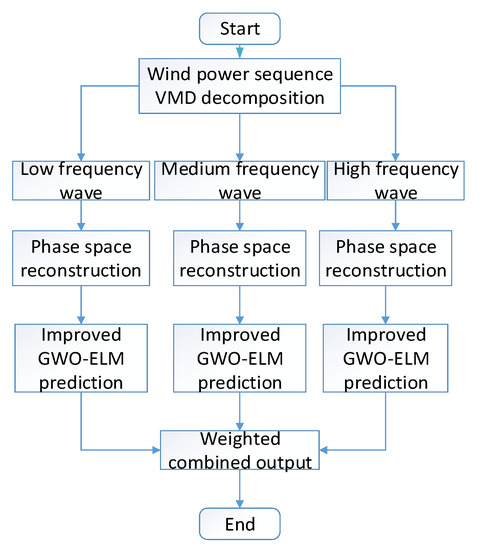 - VMD is used to decompose the original wind power sequence. Firstly, the modal components generated by decomposition of the original wind power sequence by the VMD algorithm are autonomously combined into a low-frequency wave, medium-frequency wave, and high-frequency wave respectively, according to the size of the sample entropy value. Moreover, the reconstructed waveforms are respectively predicted by the improved GWO-ELM. Finally, the results are merged into the final prediction results.